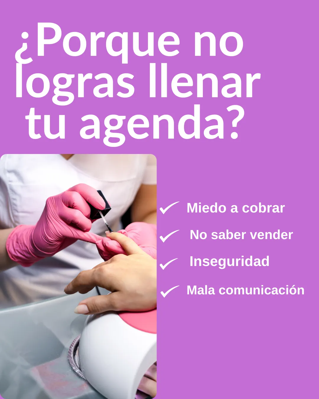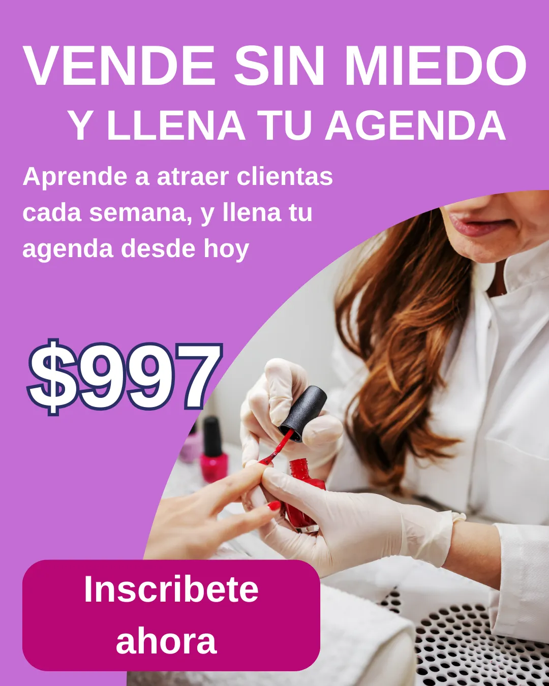 Vende sin Miedo y Llena tu Agenda es un curso creado especialmente para manicuristas que quieren mejorar su experiencia al cliente, comunicar su valor con seguridad y aprender a cerrar ventas sin miedo.